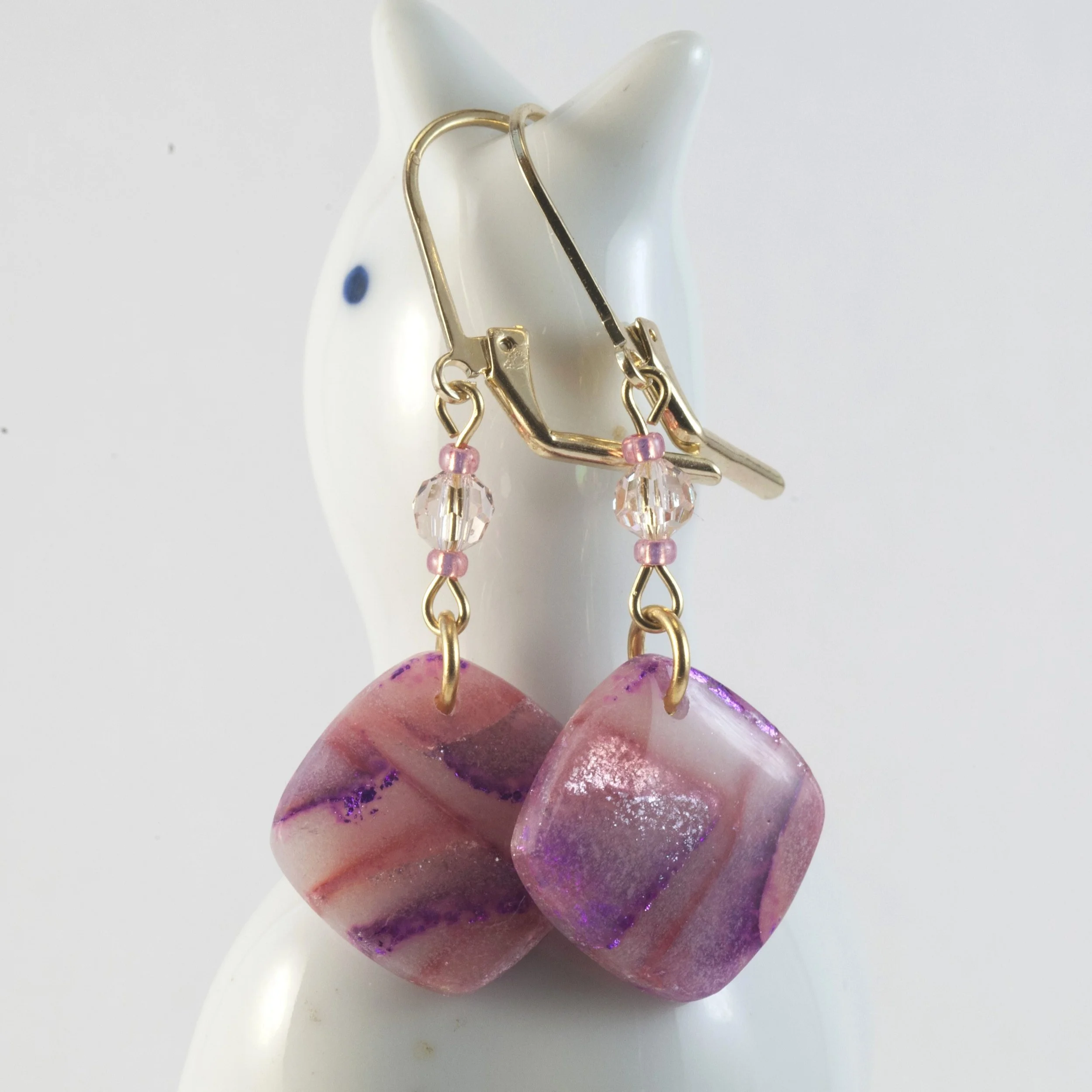 My Thanksgiving Open Studio was coming up, along with a local artisan fair. And it was a rainy day. And you can never have too many earrings for holiday sales. So I decided to play in my studio with some translucent clay, along with berry-colored acrylic paint, white alcohol ink, mica powder, and foil leaf. The unbaked clay was unremarkable (you never know how translucent clay will look when it’s baked). But what came out of the oven was a nice surprise, and after sanding, buffing, and applying resin, the finished beads are splendid — glimmery pink with a pop of metallic fuchsia. The bead patterns remind me of a topo map, and so right there, my new collection had a name. With just six pairs of earrings and one sweet necklace, this collection may be gone before you blink.